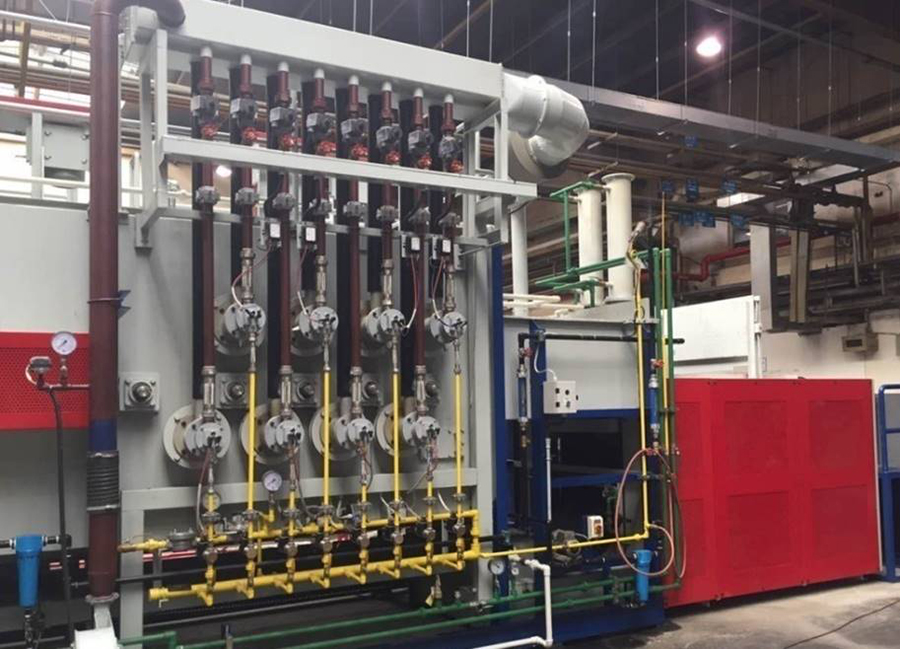 加热炉采用吸热型气体作为保护气氛,净化后的天然气作为富化气,通过特殊气氛循环设计,节约能源成本,并且可以减少积炭的形成,也可以提高托辊、耐热合金和网带的使用寿命。